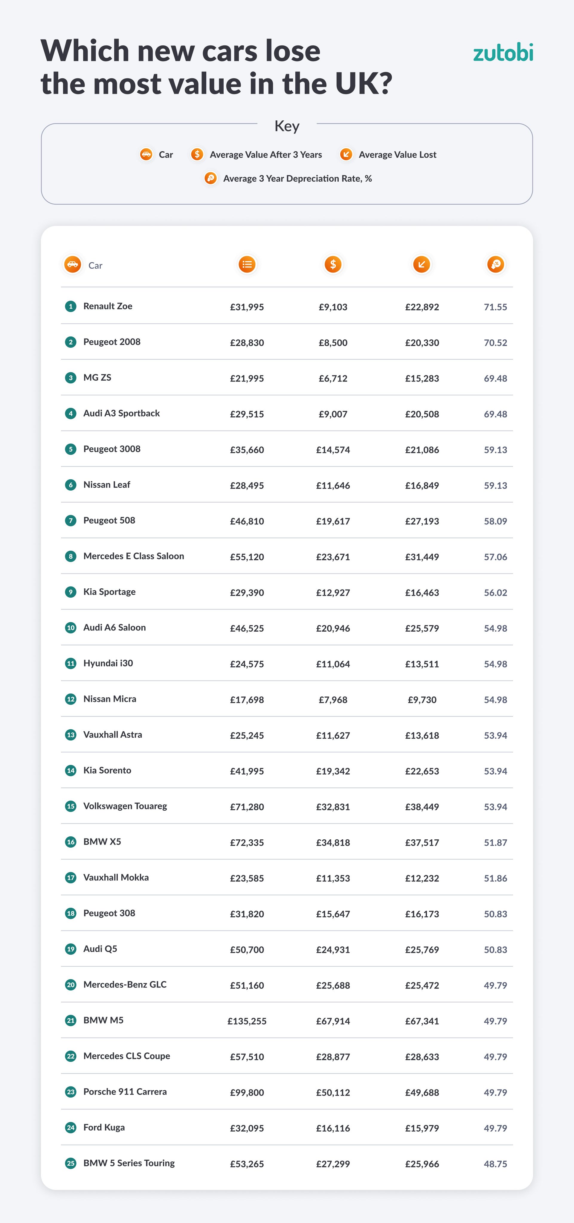 The Peugeot 3008 has the second biggest depreciation rate of any cars studied. After purchasing the vehicle for over £28,000, 3008 drivers will also be losing money every day when they get behind the wheel, on average it will lose over 70% of its value.