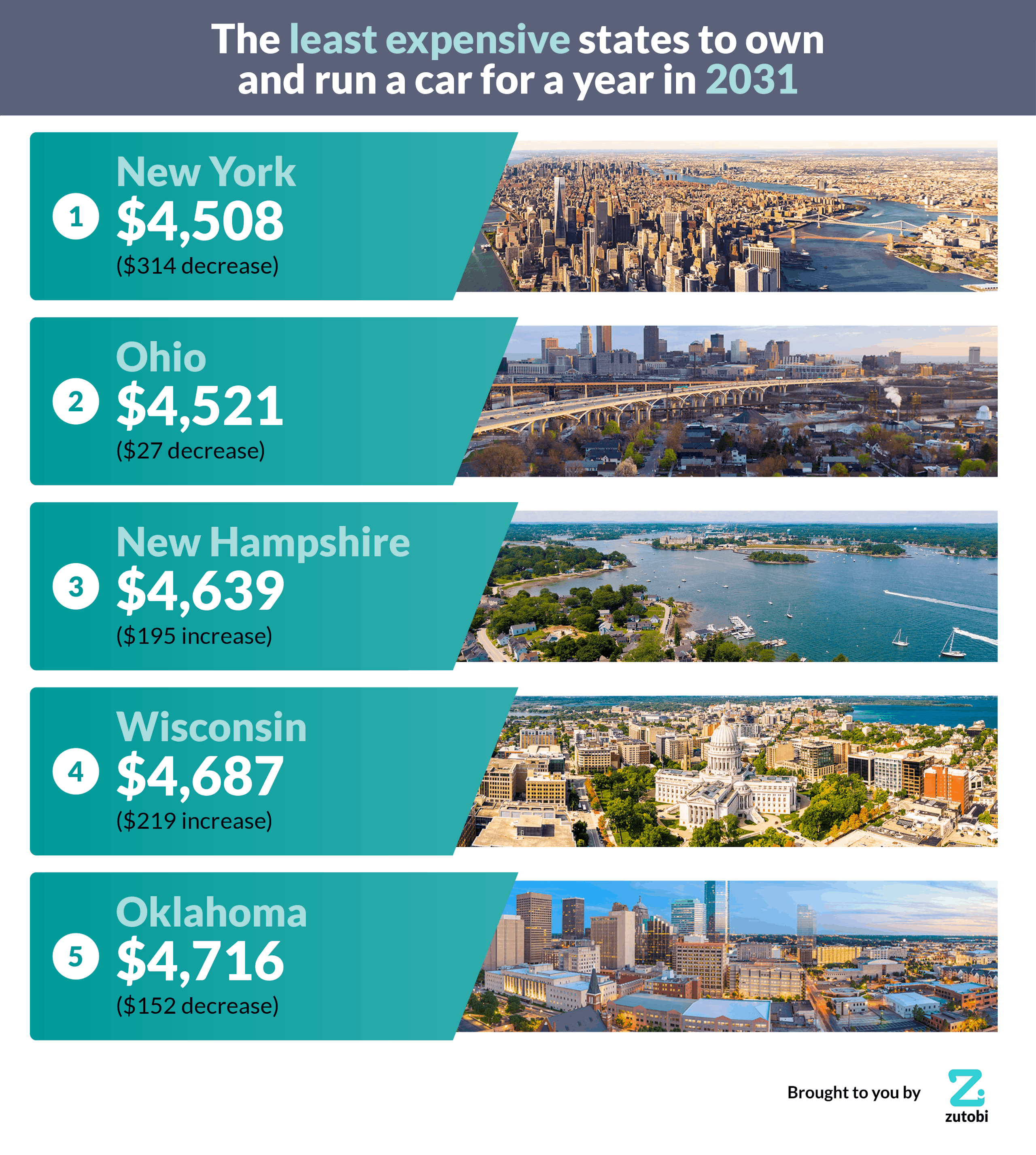 The final entry into the top five cheapest states in 2031 is Oklahoma, by 2031 estimated costs of running a car in Oklahoma will be over $4,700 which is only slightly more than Wisconsin. Although insurance and fuel costs have gone down in Oklahoma over the past decade it has happened at a lower rate than some of the cheaper states above it.