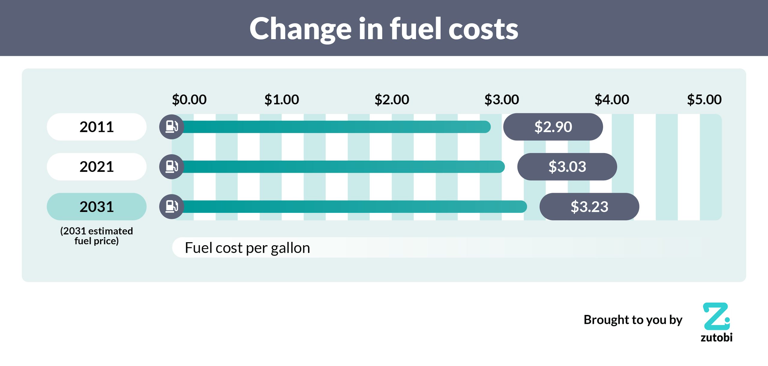 In 2011 the nationwide fuel price average was $2.90 meaning that in a decade prices had only risen by 13 cents per gallon, this equates to a 4.51% increase in costs. When applying this to our future projections we estimated that fuel costs will only rise to $3.23 per gallon in 2031 providing prices continue to rise at their current rate.