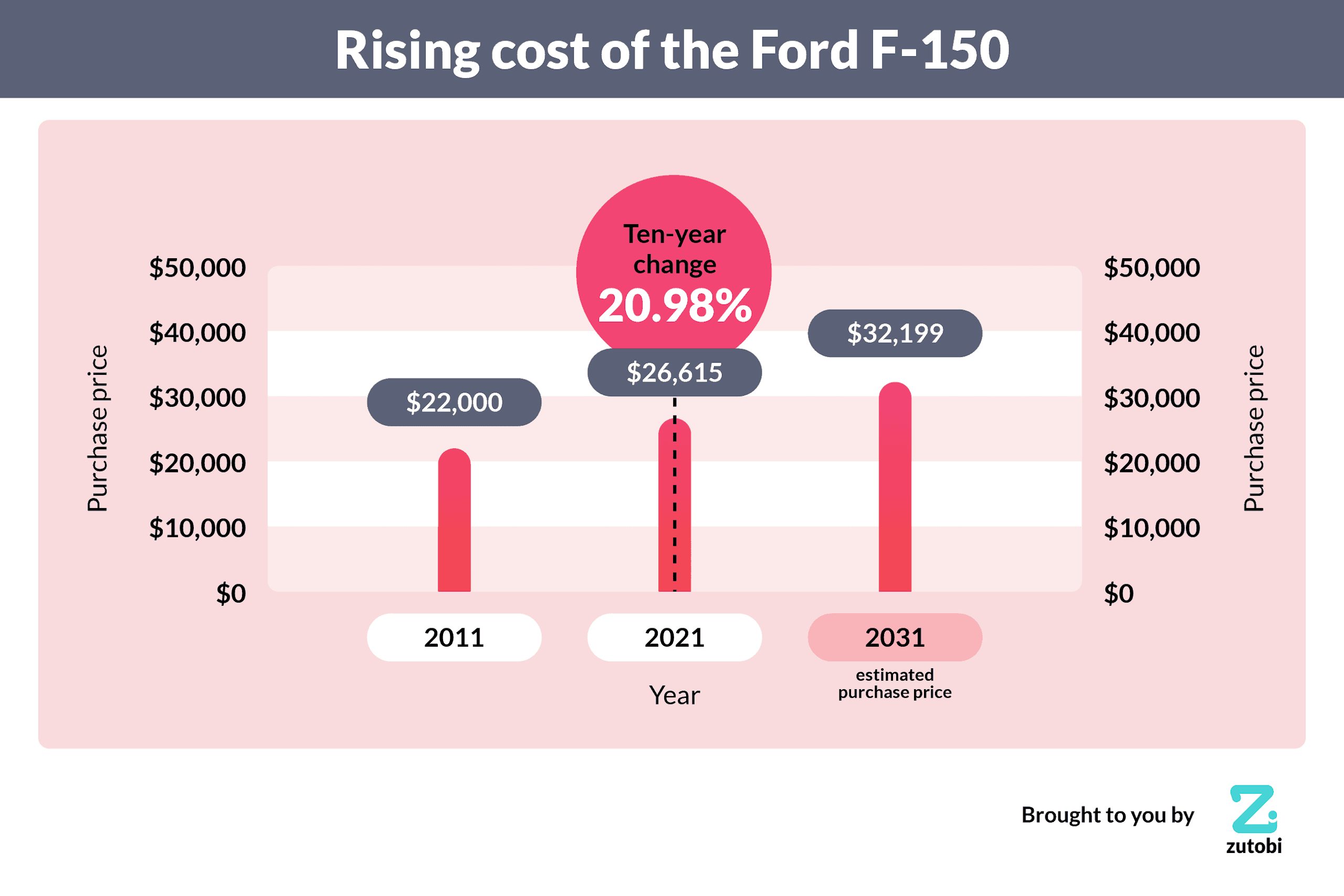 The best-selling car in the USA consistently over the past decades has been the Ford F-150 pickup truck, when it was introduced in 1948 it only cost $1,279. Since then it has become bigger and better, and in 2011 the twelfth generation of the vehicle cost $22,000 dollars when new. Today the price is $26,615, which shows a 20.98% price increase in the past decade. We therefore apply this to the cost going forward and we estimate that the cost will rise to $32,199 in 2031.