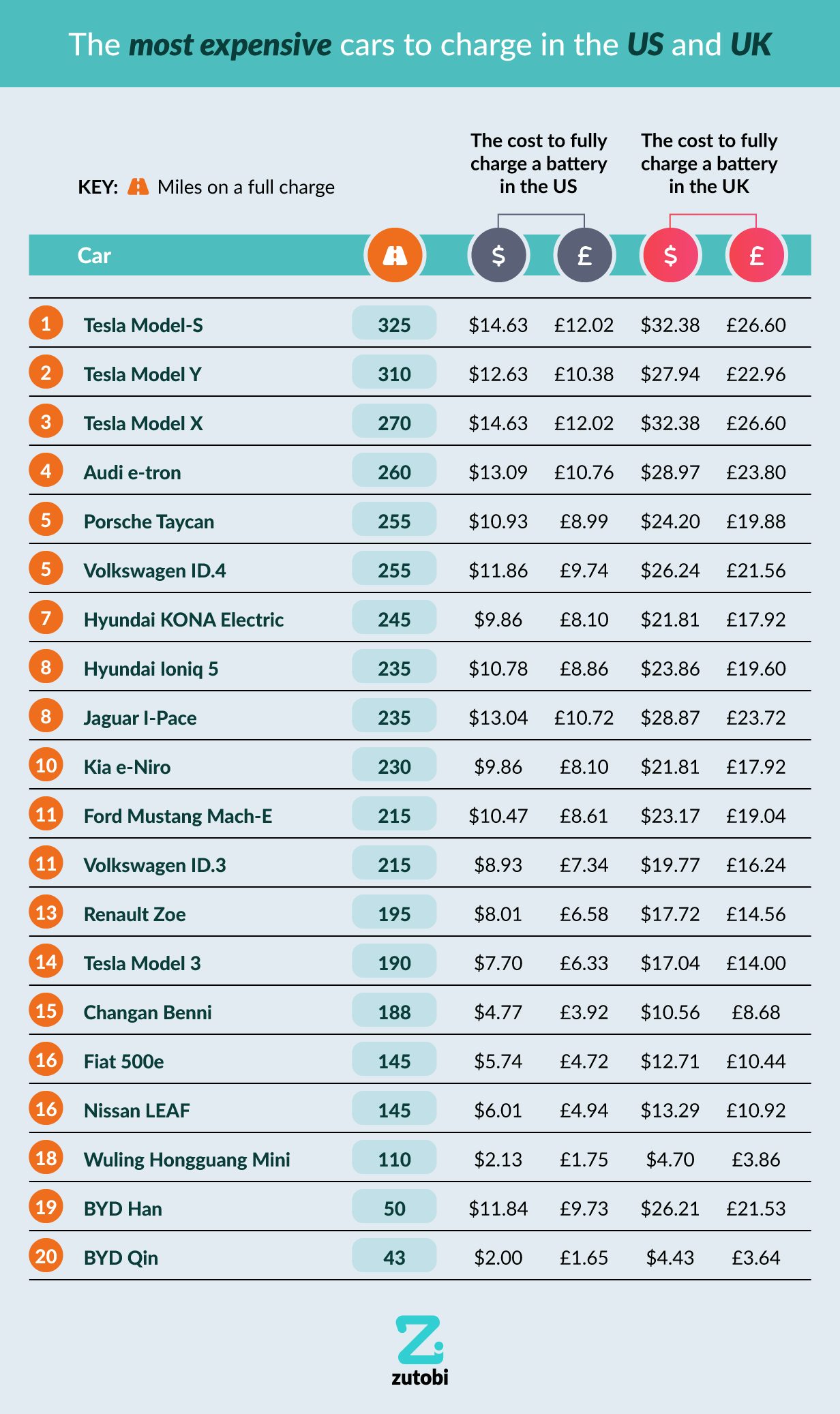 Two Tesla models share the top spot as the most expensive electric car to fully charge, as they share the same battery capacity. Both models cost $14.63 to fully charge in the US and £26.60 in the UK.