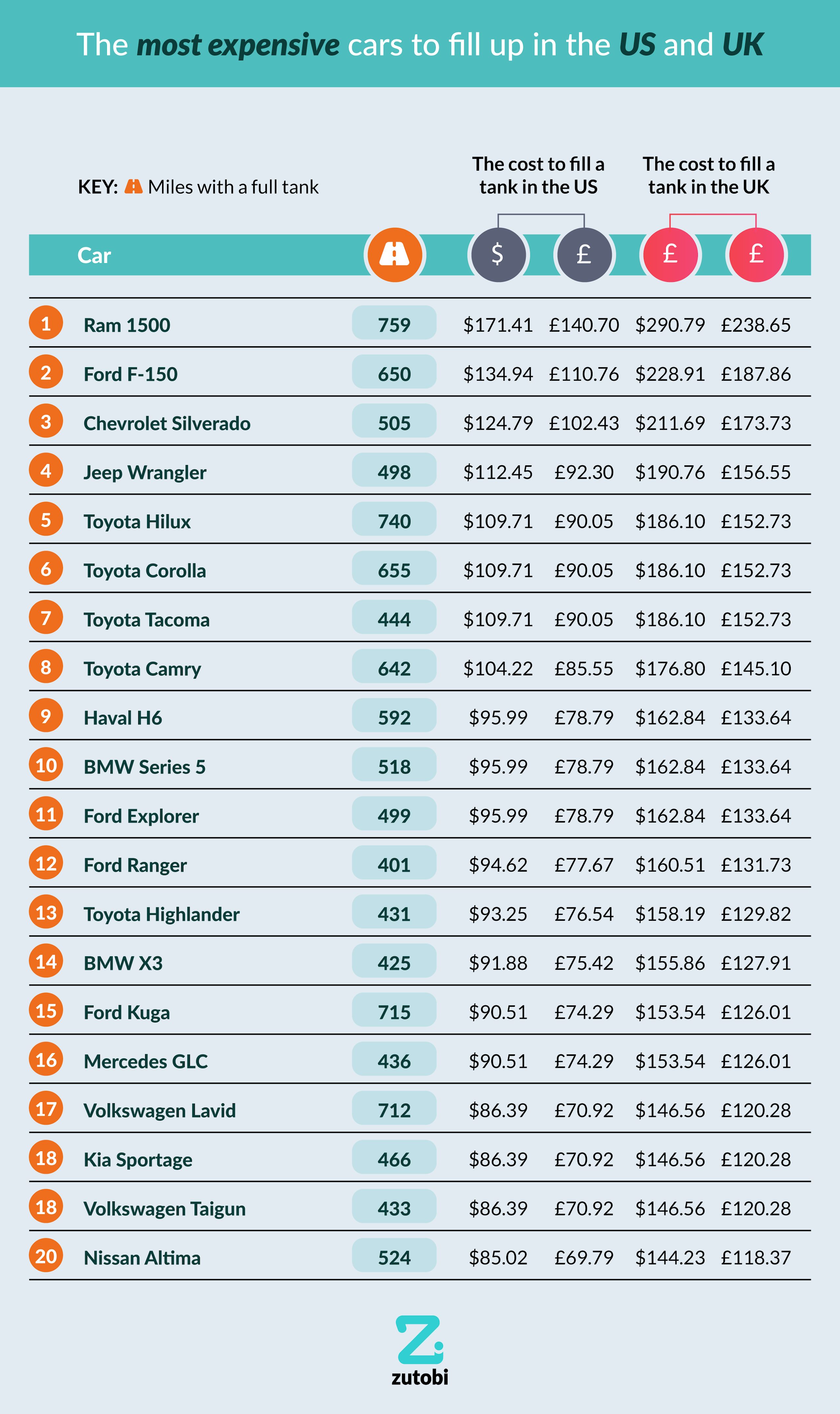 The most expensive car to fill up in both the US and the UK is the Ram 1500. The full-size pickup is currently in its fifth generation since its debut on the market over 40 years ago. Thanks to its enormous 33-gallon fuel tank, the Ram 1500 is the most expensive car to fill up, setting drivers back £238.65 in the UK, or $171.41 in the US.