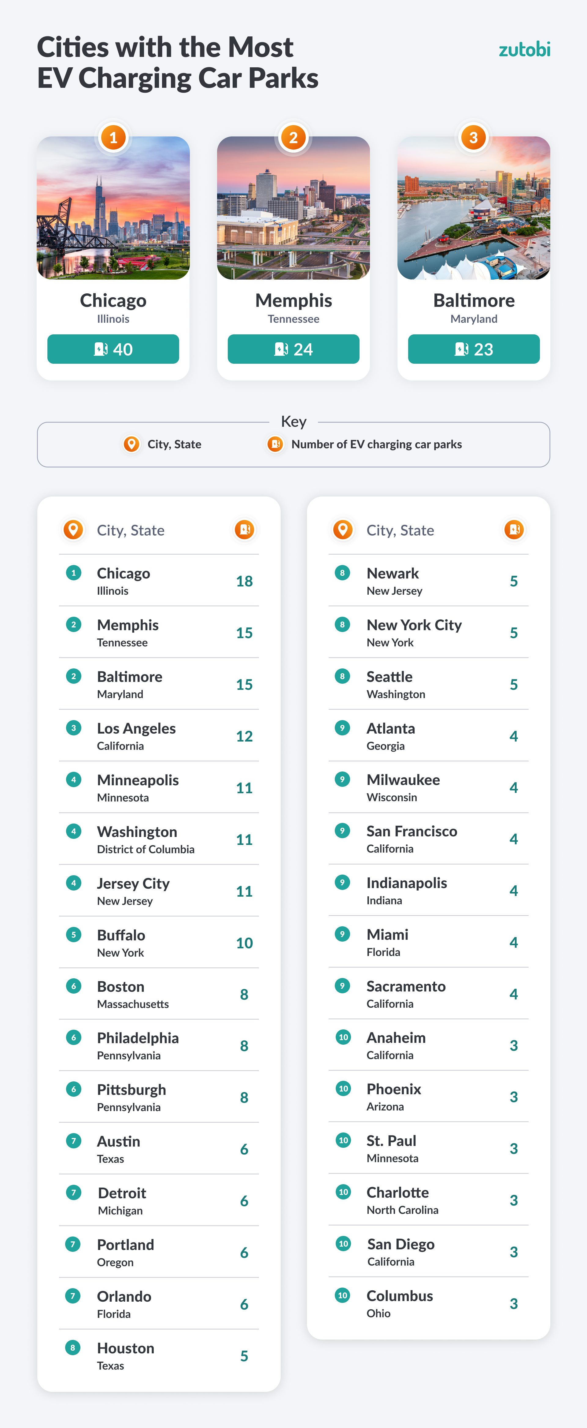 Tied for second place is Baltimore, Maryland, a city where innovation meets historic charm. With 15 EV charging car parks available, Baltimore offers convenience for eco-conscious commuters and travelers. Whether you’re navigating the Inner Harbor or venturing through one of the city’s many neighborhoods, Baltimore’s EV infrastructure supports a cleaner, greener mode of transportation across the cityscape.