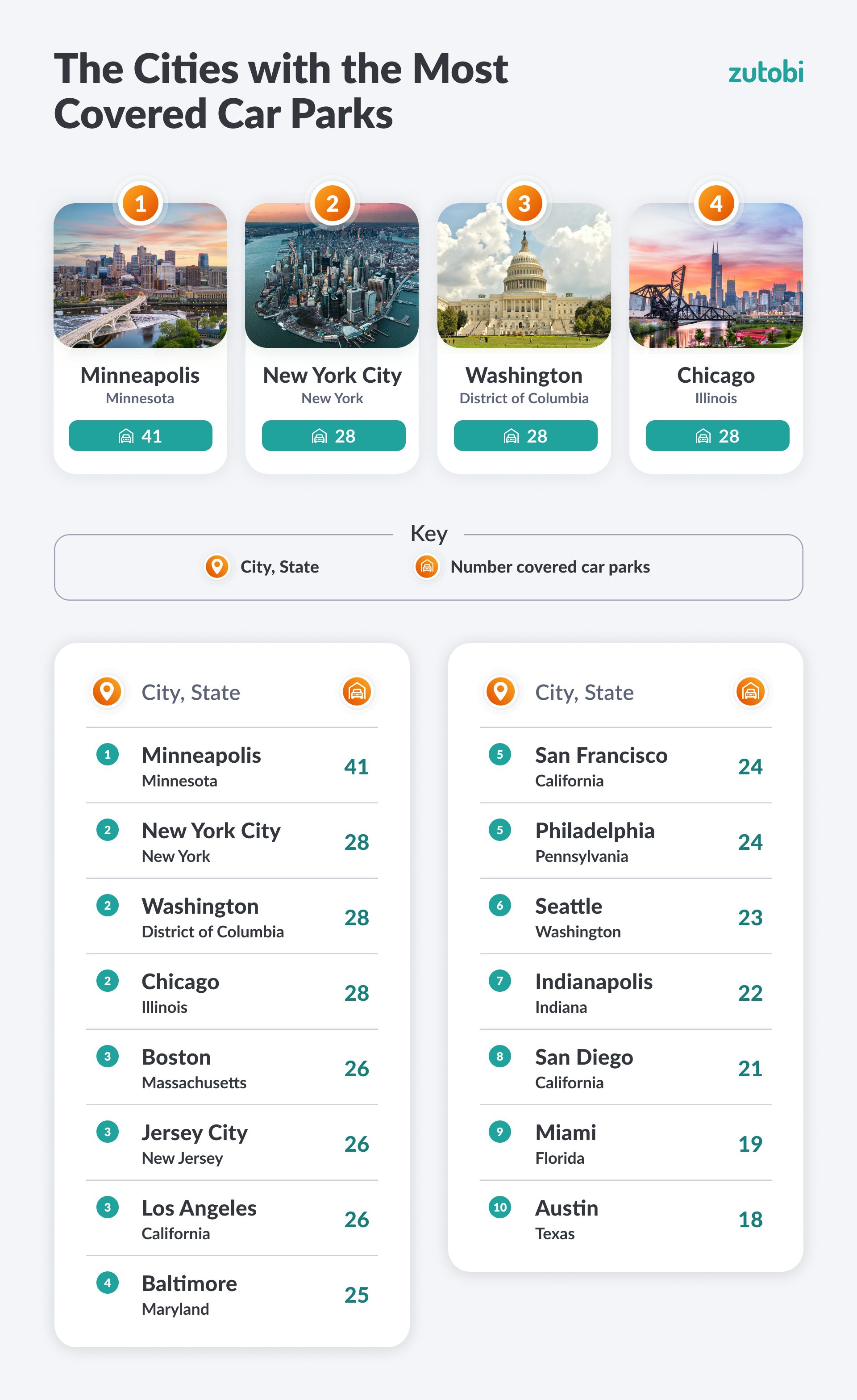 Also sharing second place is the U.S. capital, Washington, D.C. With 28 covered car parks, the city caters to a wide variety of commuters and visitors, whether they’re headed to federal buildings, museums, or high-end restaurants. Washington’s parking infrastructure offers secure, climate-resistant spaces that reflect the city’s commitment to both accessibility and urban efficiency.