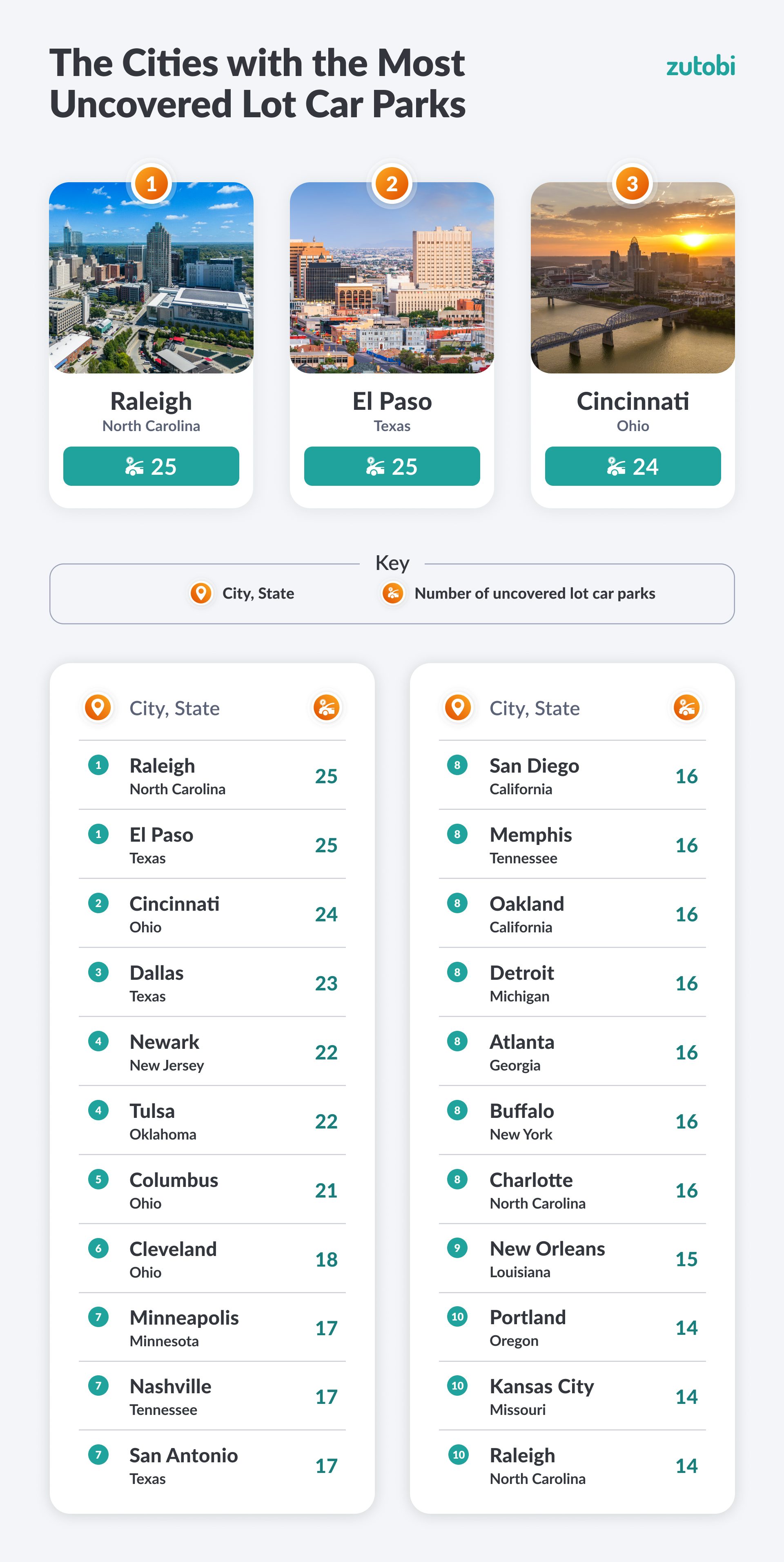 Claiming second place is Cincinnati, Ohio, a historic riverfront city that balances modern energy with classic charm. With 24 uncovered lot car parks, Cincinnati supports a driver-friendly environment that caters to everyday commuters and weekend visitors alike. Whether you’re exploring Over-the-Rhine, catching a game at Great American Ball Park, or dining along the waterfront, uncovered lots across the city provide ample, easy-to-use parking options.