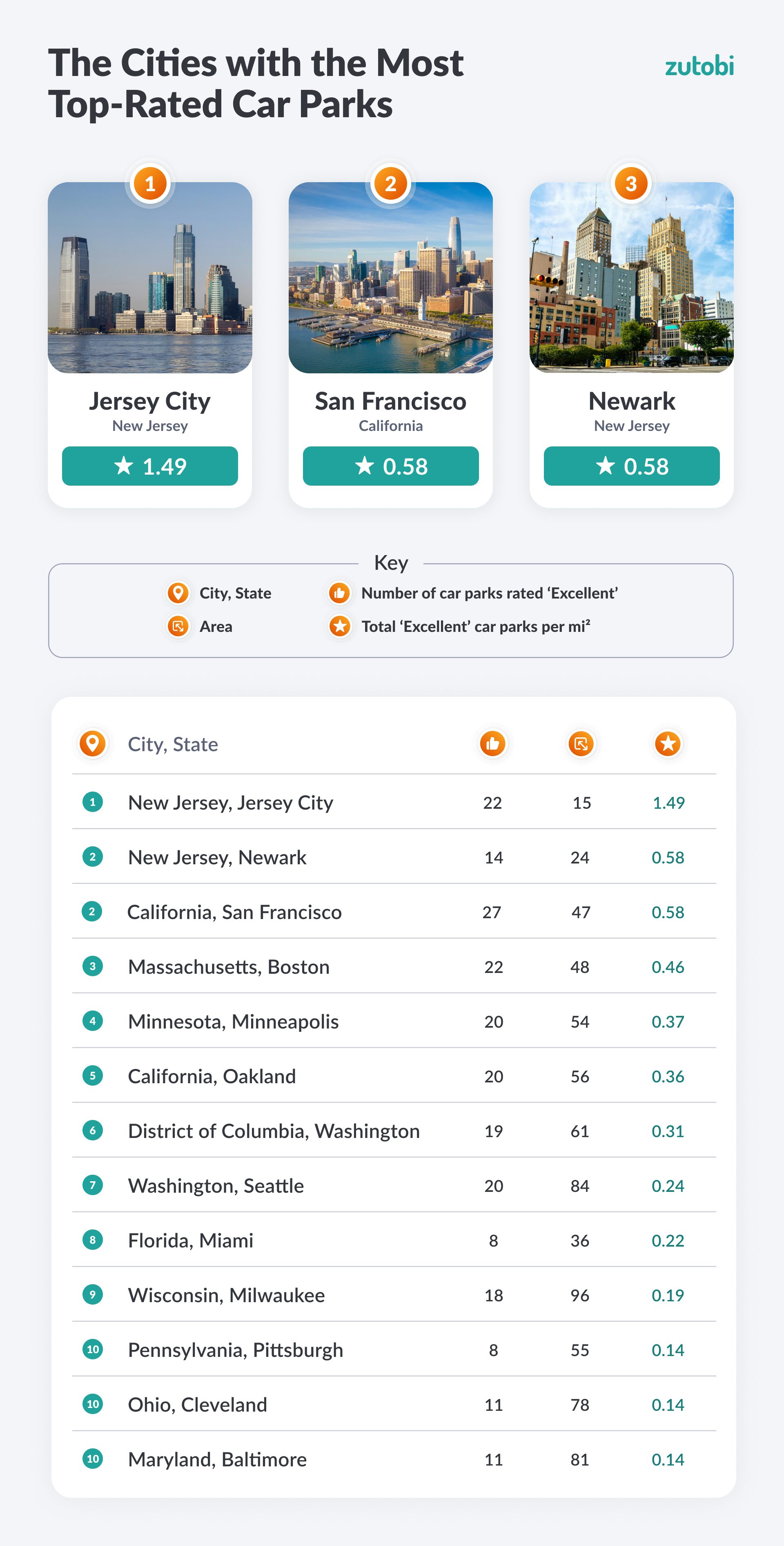 Also tied for second is Newark, New Jersey — a city rapidly redefining its urban mobility game. With 14 car parks rated ‘excellent’ across a 24 square mile area, Newark matches San Francisco in top-rated parking density. As a major transport center, Newark ensures that drivers benefit from safe, clean, and reliable facilities whether they’re catching a flight, attending an event, or commuting into NYC.