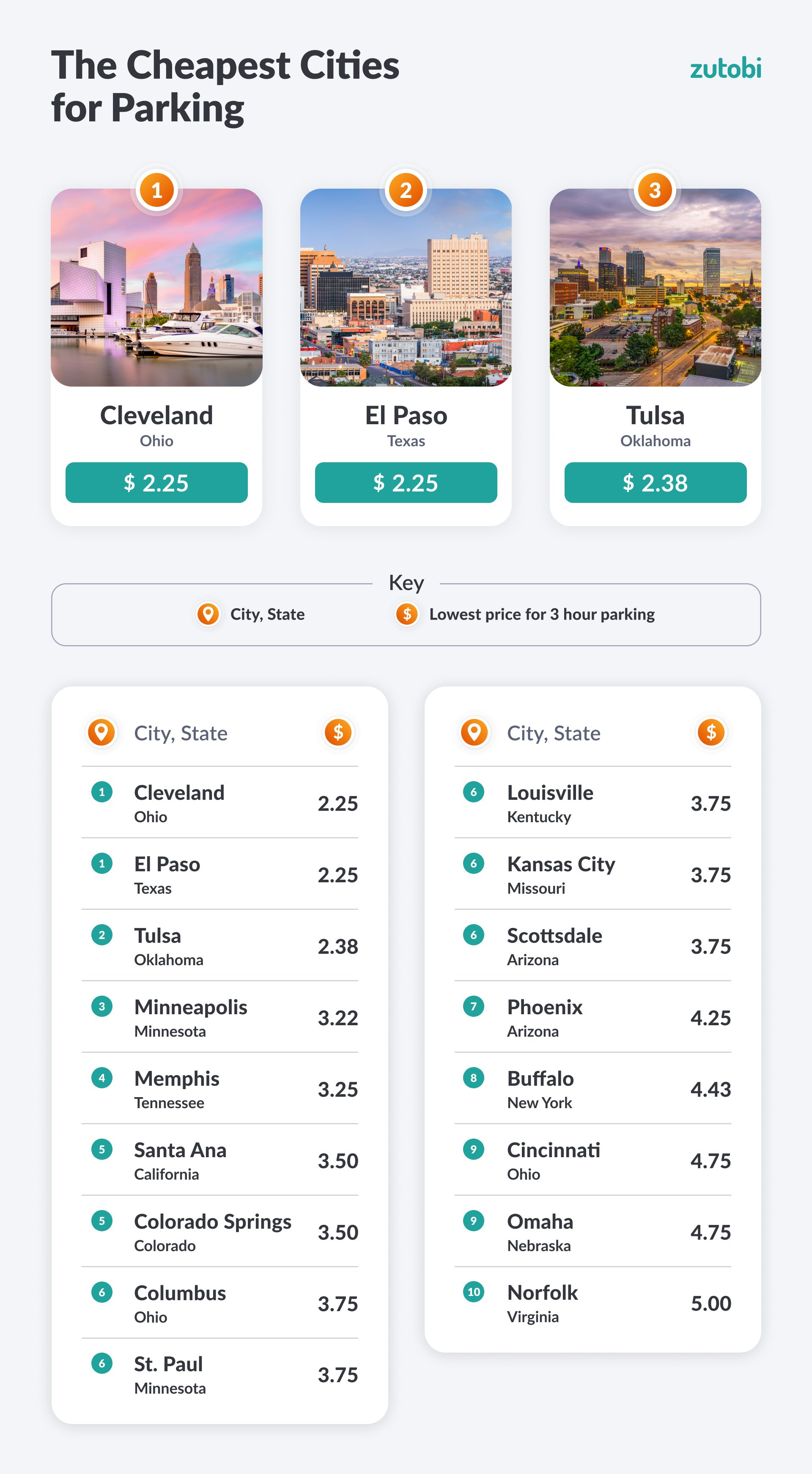Tulsa, Oklahoma takes second place with incredibly low parking rates at just $2.38 for a 3-hour stay. This up-and-coming city blends Art Deco charm with modern amenities, and its parking policies follow suit — simple, low-cost, and driver-friendly. With revitalized downtown areas and growing cultural districts, Tulsa makes navigating the city both convenient and cost-effective.