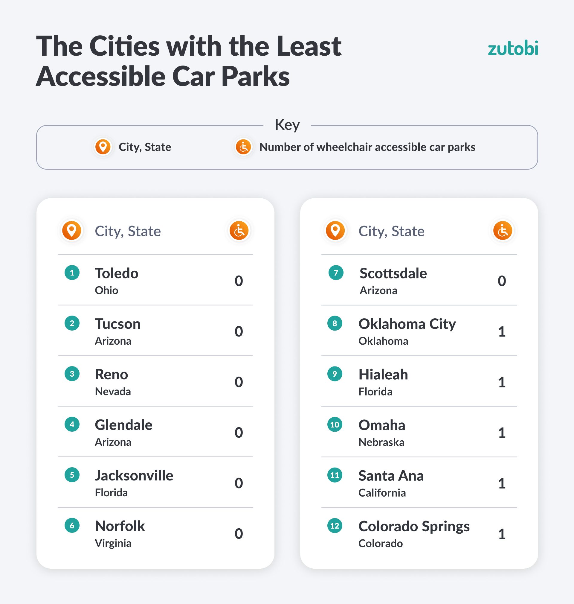 These cities, unfortunately, failed to provide car parks for those using a wheelchair. These are the cities with the least amount of accessible car parks: Omaha, Long Beach, Kansas City, Tucson, Fort Worth, Scottsdale, Santa Ana, Glendale, Colorado Springs, Toledo, Baton Rouge, Norfolk, Reno, and Jacksonville.