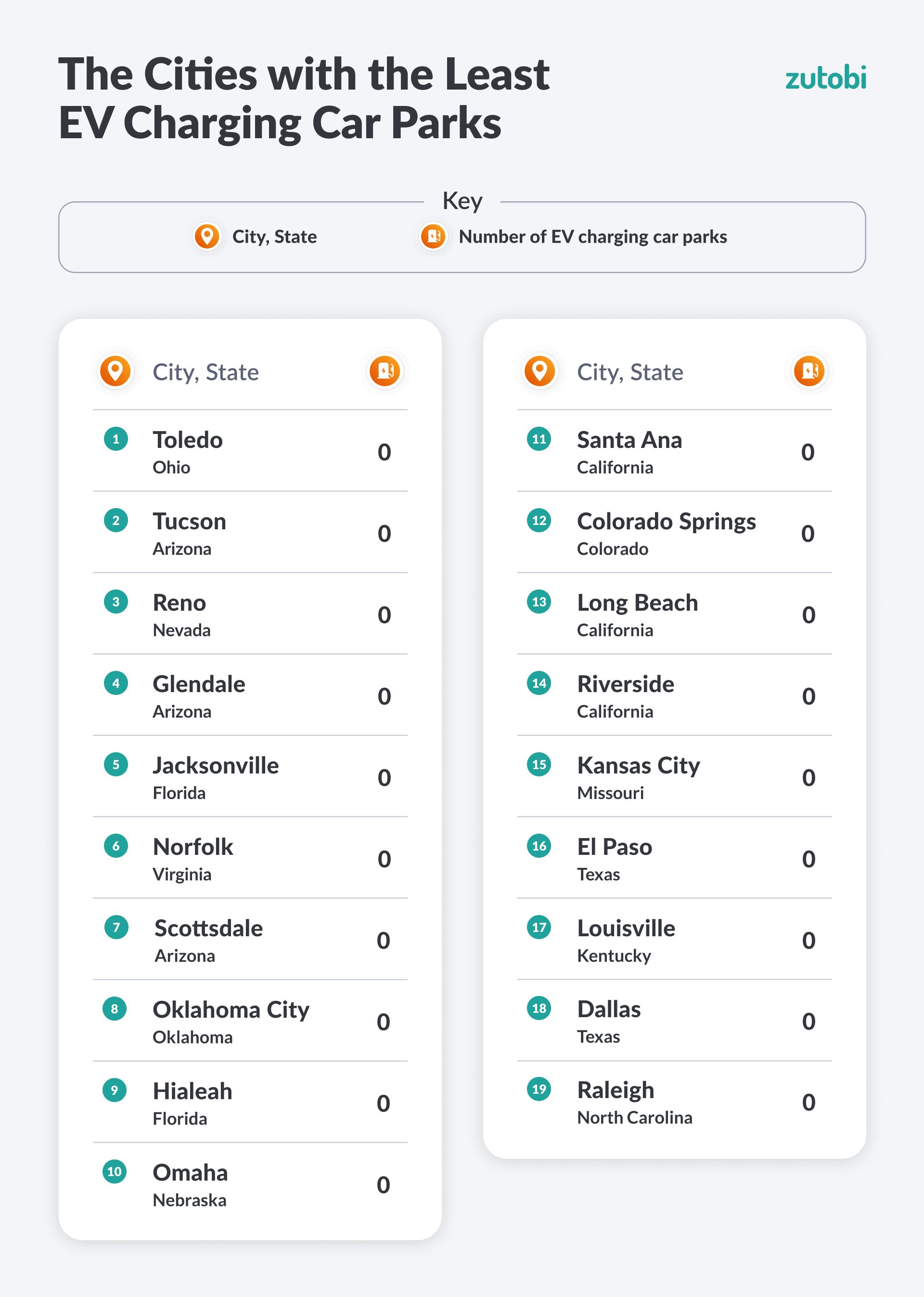 Some cities failed to provide car parks with electric vehicle charging facilities. These are the cities with the least EV charging car parks: Omaha, Long Beach, Kansas City, Tucson, Fort Worth, Scottsdale, Santa Ana, Glendale, Colorado Springs, Toledo, Baton Rouge, Norfolk, Reno, Jacksonville, Hialeah, Tampa, Riverside, Lexington, Buffalo, Richmond, Oklahoma City, El Paso, and Tulsa.