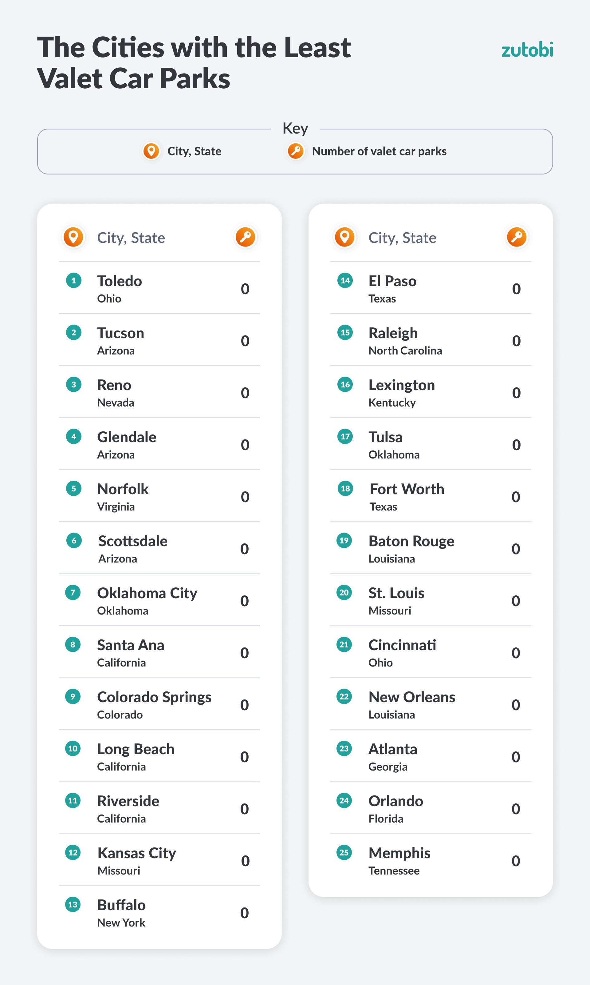These cities had the lowest amount of valet car parks in the area: Omaha, Long Beach, Kansas City, Tucson, Fort Worth, Scottsdale, Santa Ana, Glendale, Colorado Springs, Toledo, Baton Rouge, Norfolk, Reno, Jacksonville, Tampa, Riverside, Lexington, Buffalo, El Paso, Tulsa, Charlotte, Orlando, St. Louis, Memphis, Cincinnati, and Raleigh, which all had 0 valet parking options.
