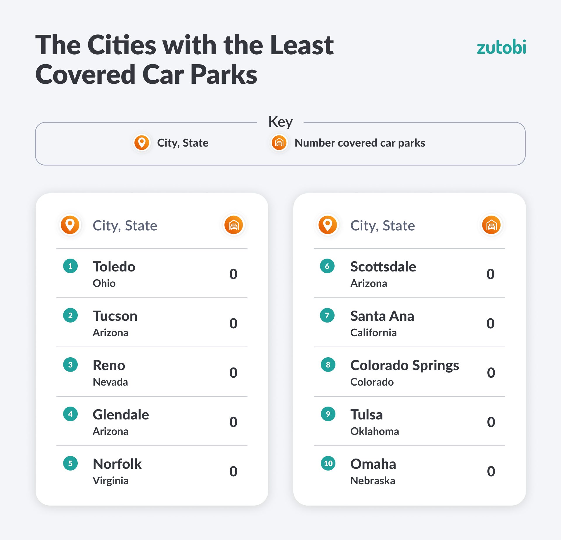 These cities with the least covered car parks: Omaha, Kansas City, Tucson, Scottsdale, Santa Ana, Glendale, Colorado Springs, Toledo, Baton Rouge, Norfolk, Reno, Jacksonville, Riverside, Buffalo, and Richmond.