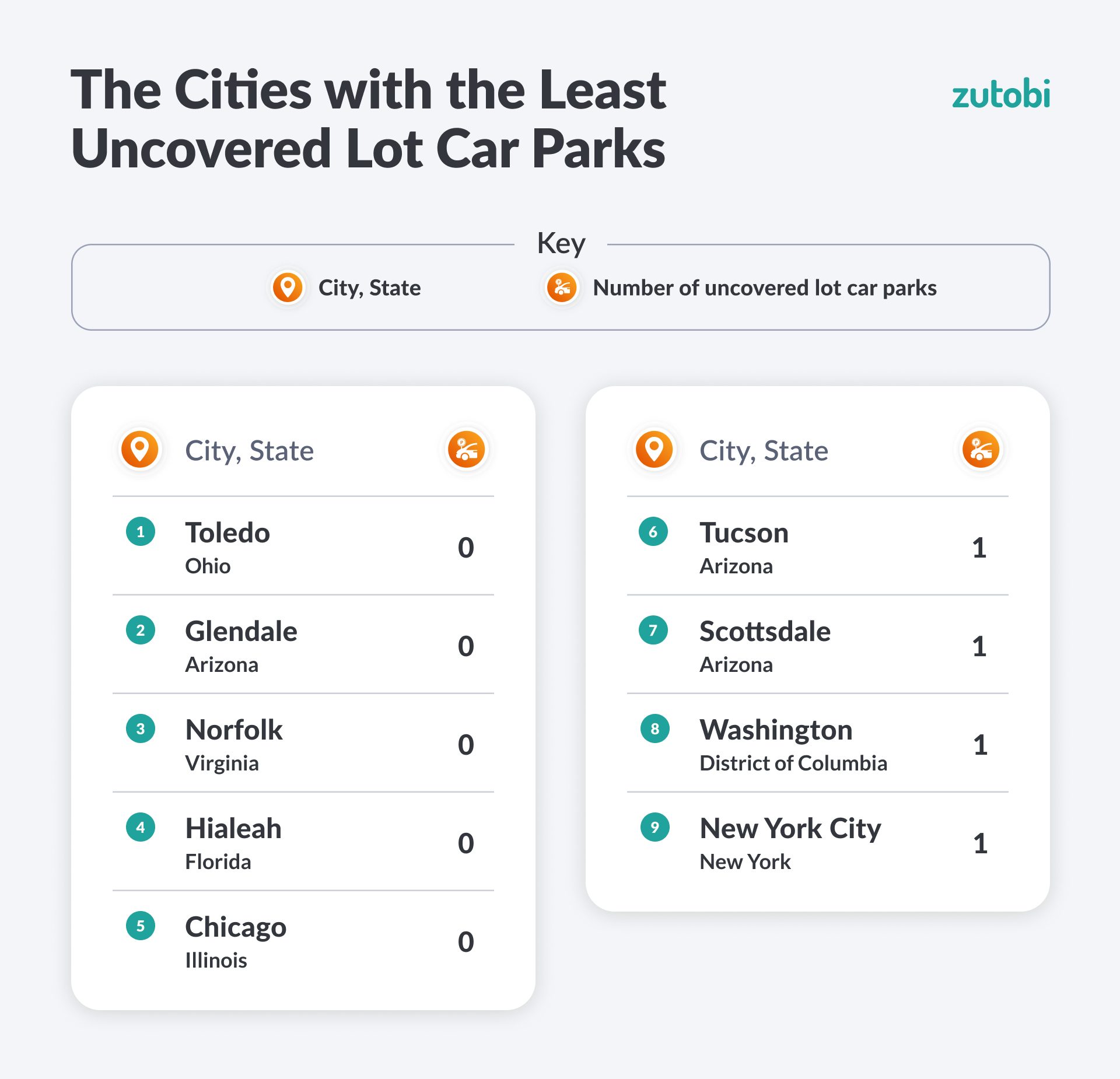 These cities had the lowest number of uncovered lot car parks: Glendale, Toledo, Baton Rouge, Norfolk, Reno, Jacksonville, Hialeah, Long Beach, Washington, Tucson, Santa Ana, Tampa, Lexington, and Sacramento, along with Chicago.