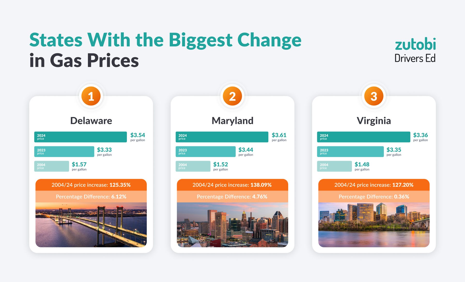Delaware experienced the largest increase in gas prices over the past year. In 2004, the price per gallon was $1.57. By 2023, it had increased to $3.33, and in 2024, it further rose to $3.54 per gallon, a 6.12% increase over the past year. Over the last 20 years, Delaware’s gas prices have increased by 125.35%.