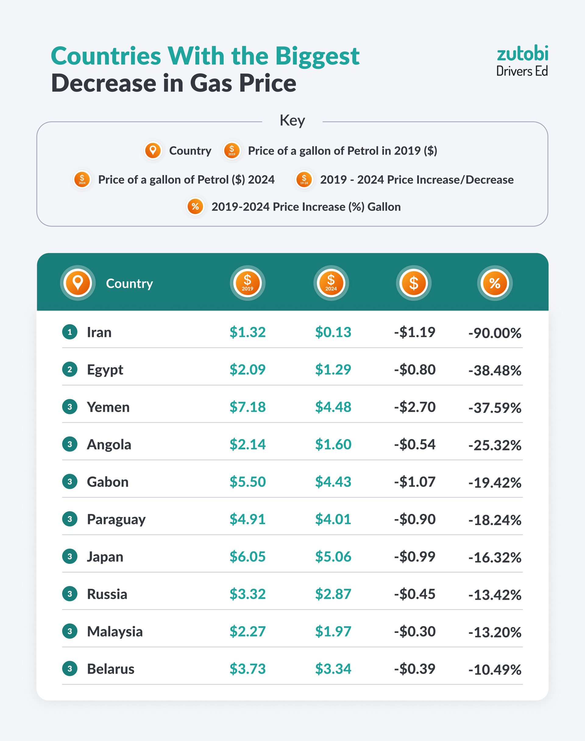 Although not as drastic as Iran, Egypt has also experienced a whooping decrease in fuel costs in the last five years. With a drop of almost 40%, the country’s price went from $2.09 per gallon in 2019 to only $1.29 per gallon at present.