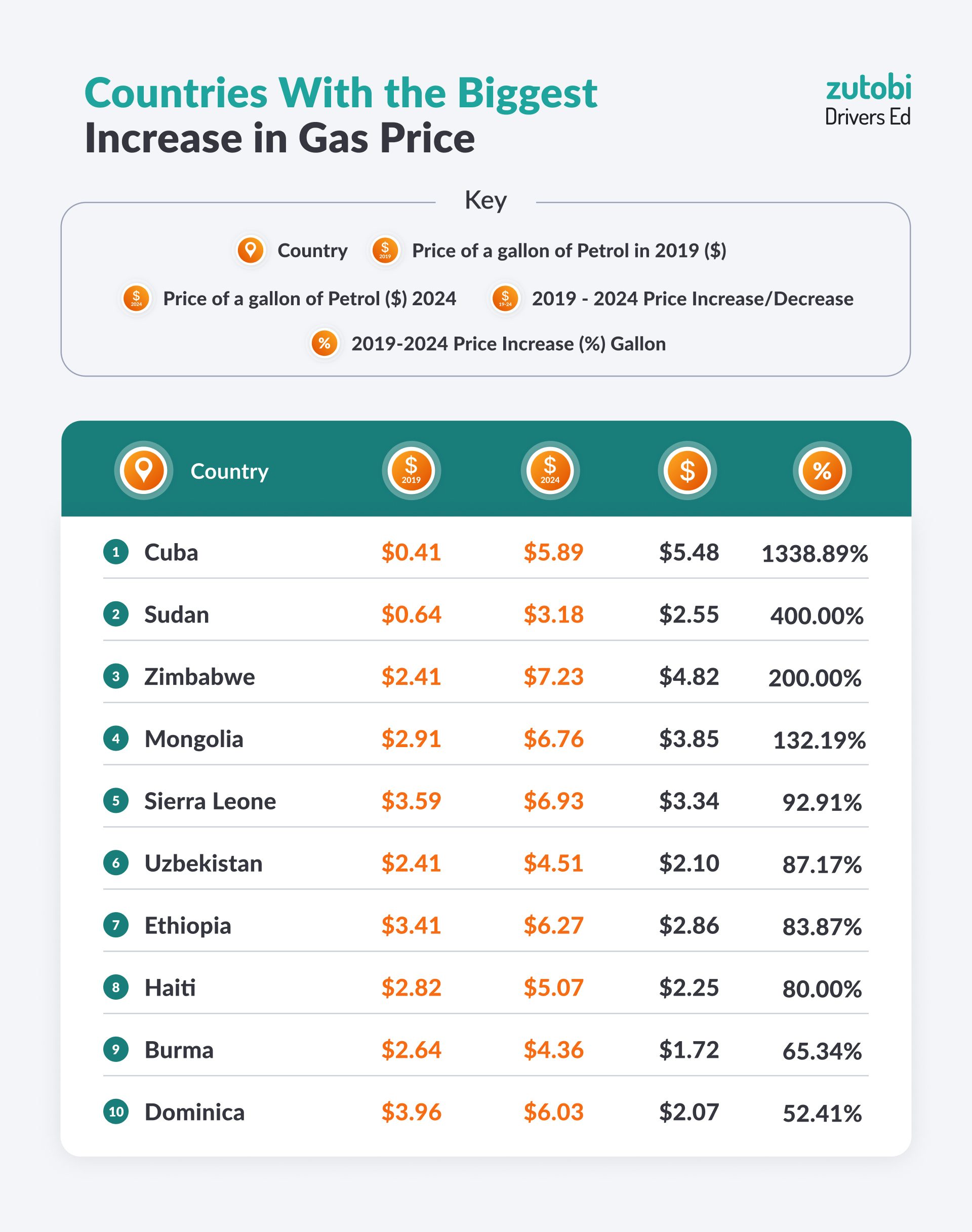 Cuba faced the highest gas price increase over the last five years with fuel prices more than 10 times to $5.89 per gallon. Over the past 5 years the increase has been more than 1300%.