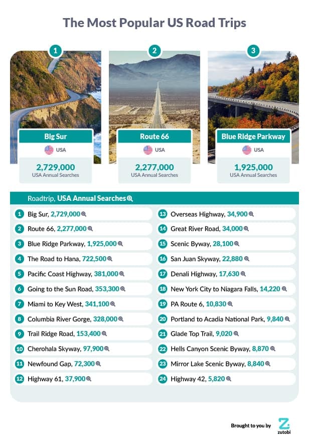 - We looked at multiple online articles listing popular routes to create lists of global, US, and UK road trips to reveal 80 global road trips, 25 UK trips, and 25 US trips.