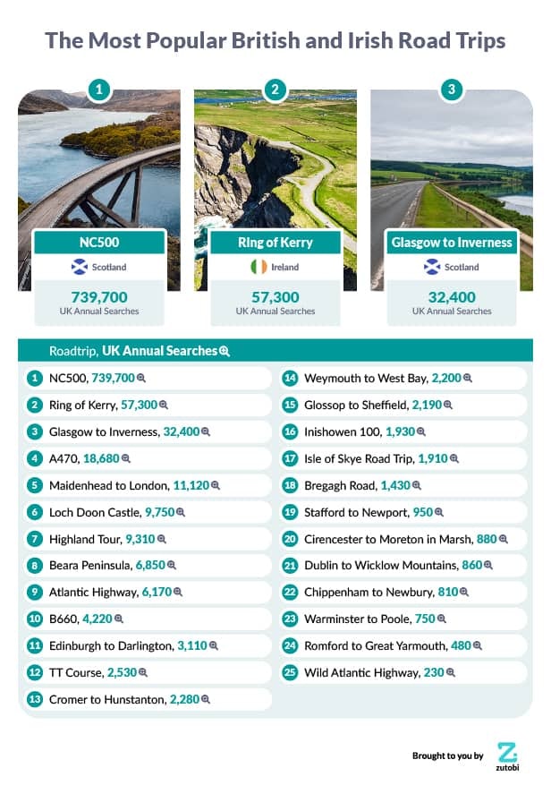 Maintaining its number one spot as the most searched domestic road trip by British citizens is the North Circuit 500 (NC500) in Northern Scotland, achieving over 150,000 additional annual searches compared to last year. This beautiful and majestic road trip has become increasingly popular in recent years, and it is no surprise as to why, with beautiful driving roads flowing through spectacular mountains and coastline.