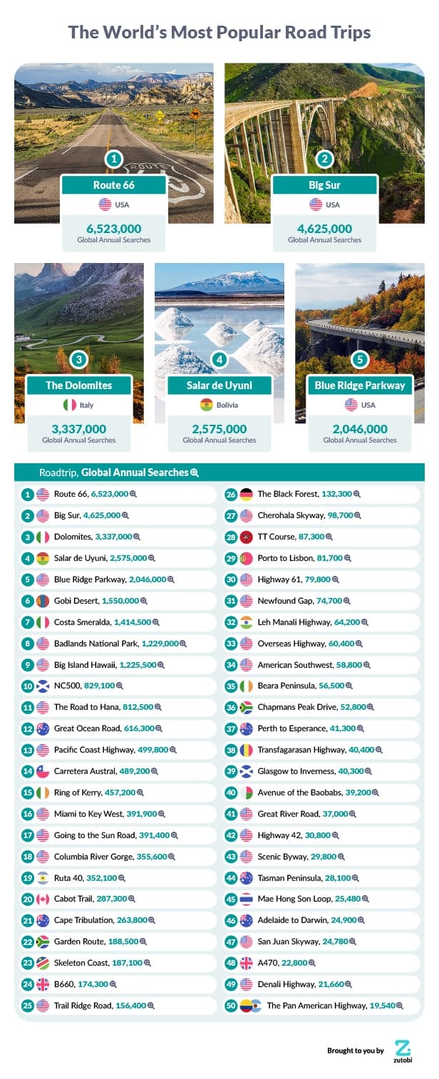 Route 66 is the road trip location that is the most searched in most countries with 46 nations having it as their most popular road trip. The second and third routes which came top in the most countries are the Dolomites and Big Sur, being the most popular in 21 and 19 countries respectively.